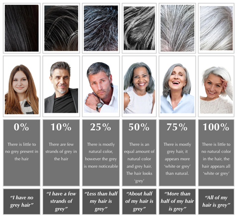 Looking at the image above, what is your CURRENT hair color (on your mid-lengths and ends)?How much (if any) gray hair do you currently have?